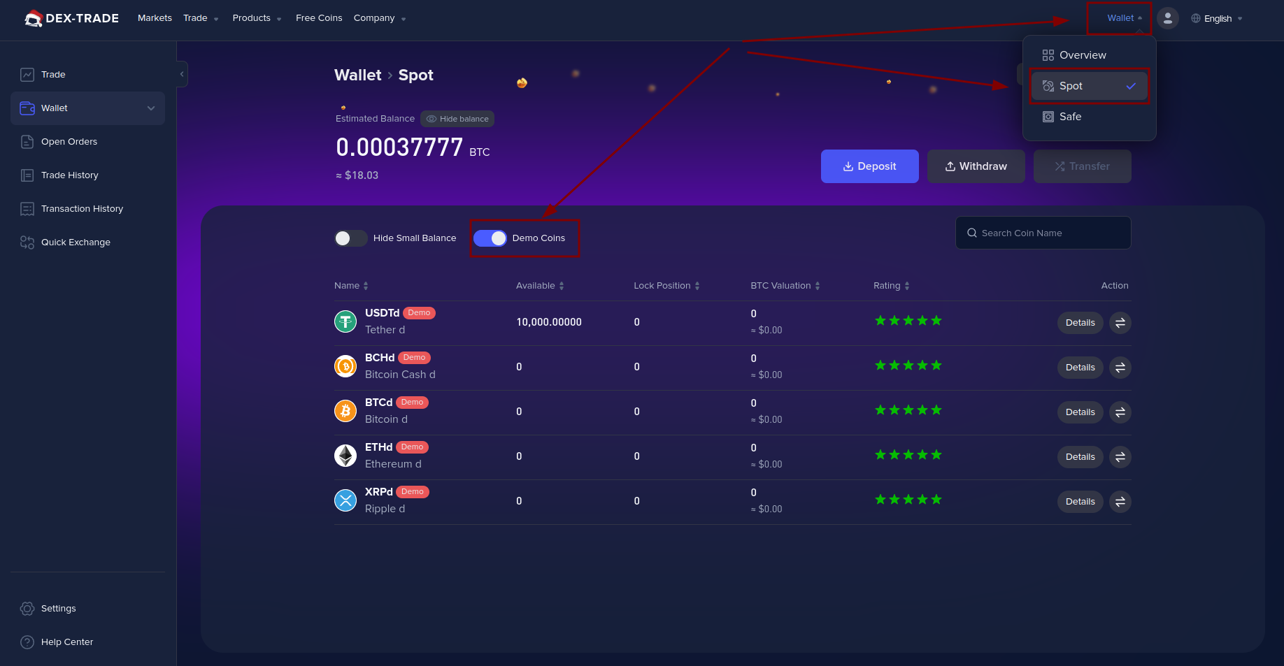 6. Then you need to switch the checkbox to demo coins.
